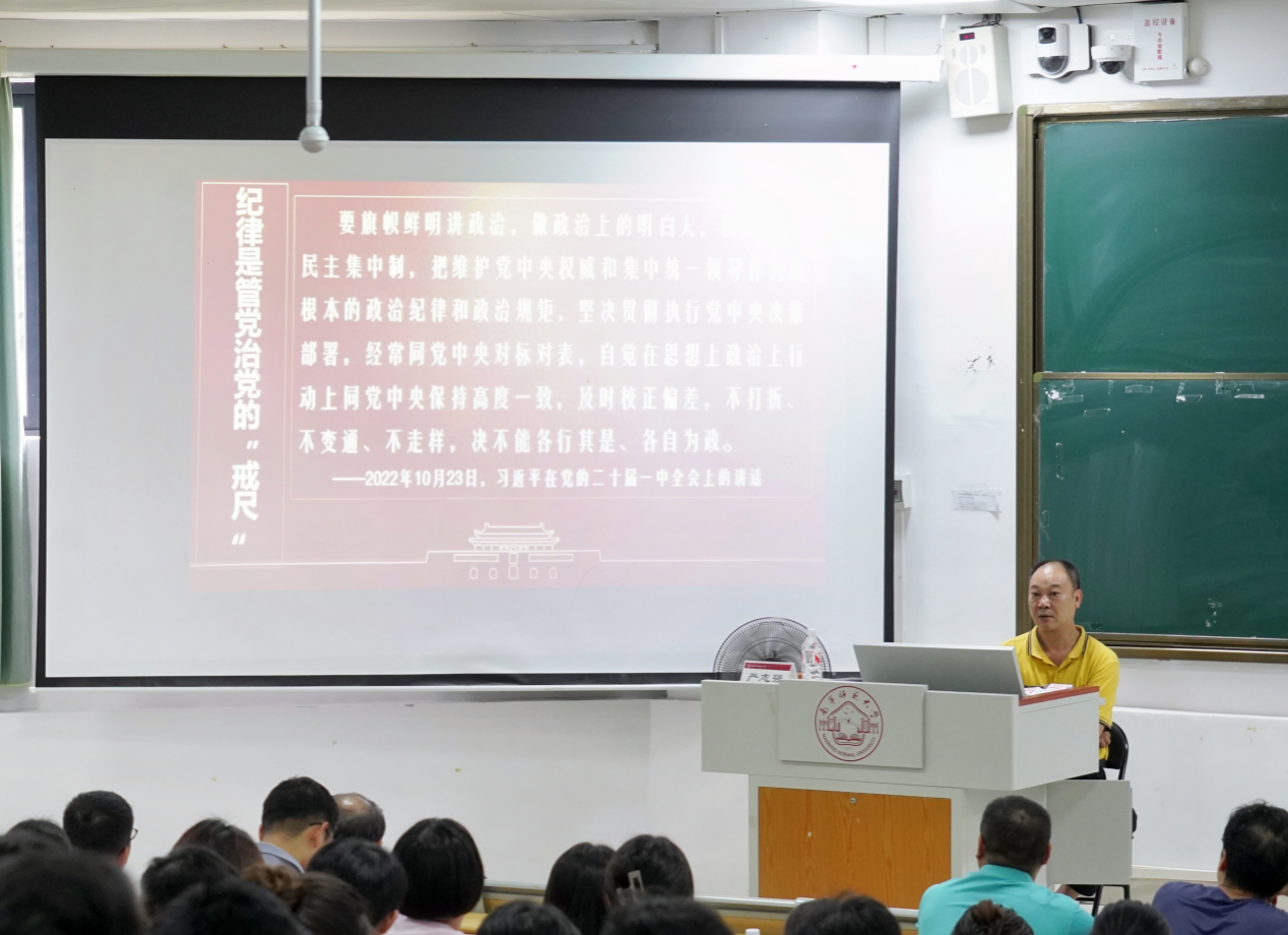 6月18日,suncitygroup太阳成集团党纪学习教育专题党课暨第二十期预备党员培训班第三讲在武鸣校区1号教学楼114教室举行,学院党委书记严志强担任主讲人,教工党员代表和学生预备党员共计150余人参加。