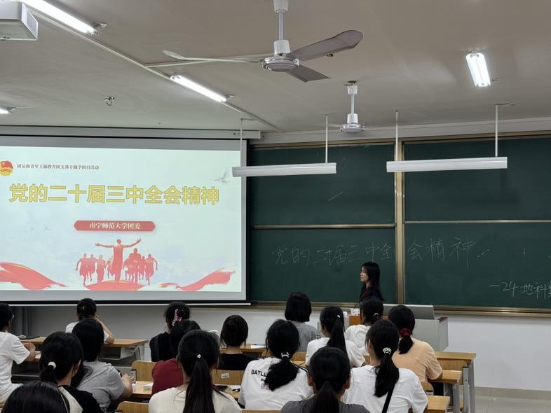 党的二十届三中全会是在全面建设社会主义现代化国家新征程开局起步的关键时期召开的一次具有里程碑意义的重要会议。为了深刻认识全会的重要意义,贯彻落实好会议精神,2024年9月20日,2024级地科类5班在武鸣校区实验楼2-C203举办了以“党的二十届三中全会精神”为主题的团日活动。本次活动由团支书韦钰淑主持,全体同学共同参与。