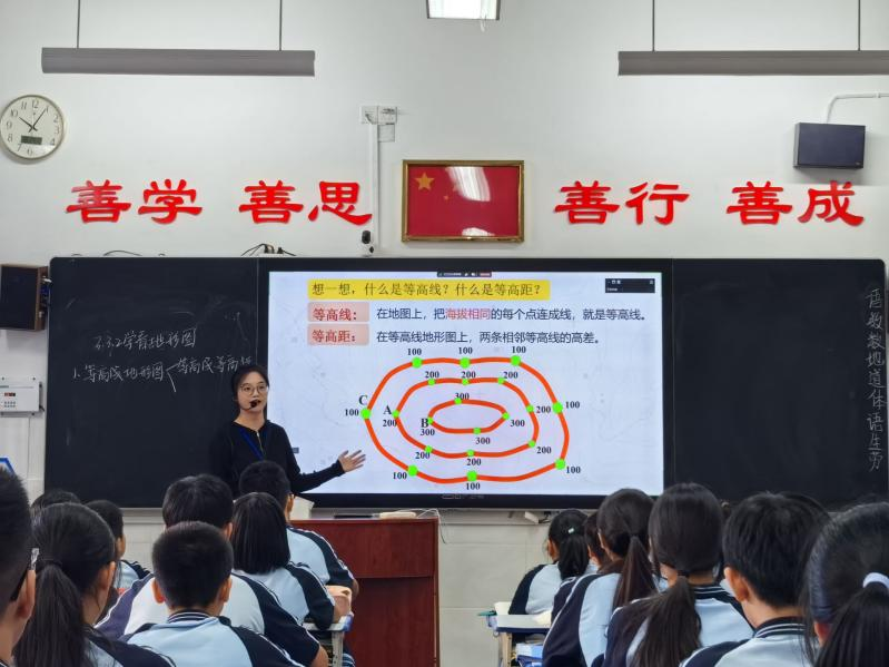罗露兰:等高线地形图在日常生活和普通的旅途中不常用,但是学会阅读和使用等高线地形图是非常重要的地理素养。张文洁老师选择了“踏足青秀山,等高线间绘山川”作为情景串联整节内容,激发了学生的学习兴趣,也体现了等高线地形图的重要性。由寻找山顶—选择登山路线——登高望远,内容层级递进。为了让学生更好地识别山体的基本部位,张文洁老师选取梯田进行形象展示和讲解,最后进行总结。山谷线和山脊线是考点,也是学生容易混淆的点,此处进行难点突破,张老师通过梯田总结出:凸低为脊,凸高为谷,并通过手作为模型讲解山脊和山谷,这样学生就很好辨认出了山谷和山脊的不同。最后设置了趣味活动,小组合作:手背山体等高线模型,让学生用笔在手背上画等高线,在手背山体上找到各个山体部位,很好地体现了地理实践力。我觉得在磨课中,“磨”出教师把握教材的深度;“磨”出学生主体求知的需求;“磨”出教师创新思维、创新情境的火花。也只有这样,我们才能不断地突破自我,破茧成蝶,遇见更优秀的自己!