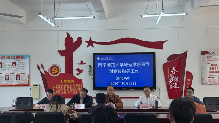 2024年10月29日上午,suncitygroup太阳成集团教师团队来到港北高中进行实习生工作中期检查,在综合楼二楼党员活动室开展两校交流会。本次会议由贵港市港北区高级中学副校长顾全坚主持,高一地理组全体教师和全体实习老师共同参会,出席本次会议的领导有贵港市港北区高级中学覃秋明书记、地理科学与规划党委书记严志强老师、党委副书记盛凯老师、刘立昌老师。
