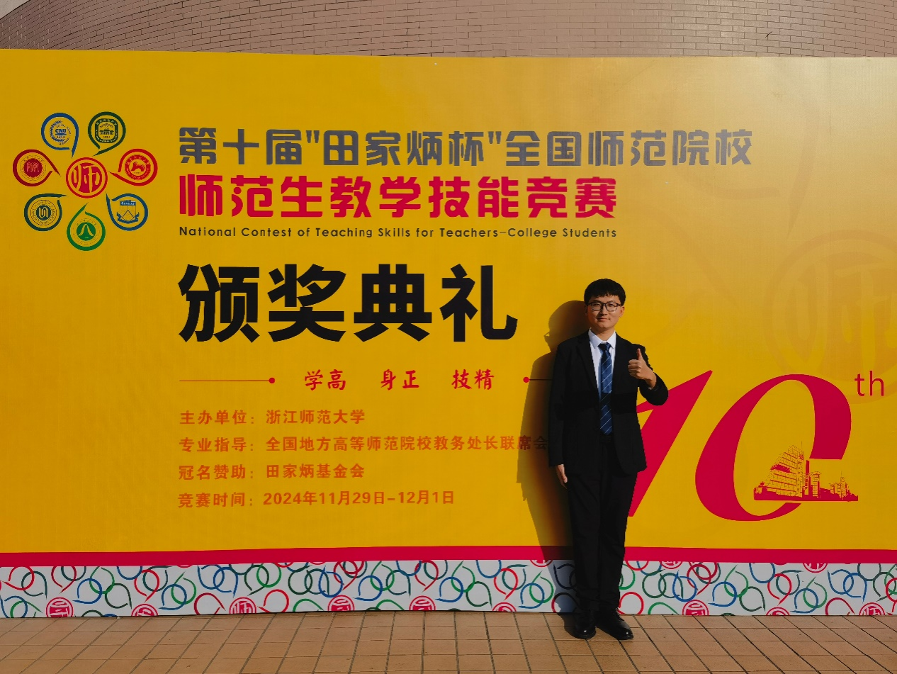 2024年11月29日至12月1日,第十届“田家炳杯”全国师范院校师范生教学技能竞赛的决赛在浙江师范大学举行。在梁浩原、廖伟业、韦晨等老师指导下,地理学院2021级地理科学专业陶行知实验班邱大成同学,经过初赛严格选拔,成功晋级决赛,并在决赛的激烈角逐中荣获全国二等奖。