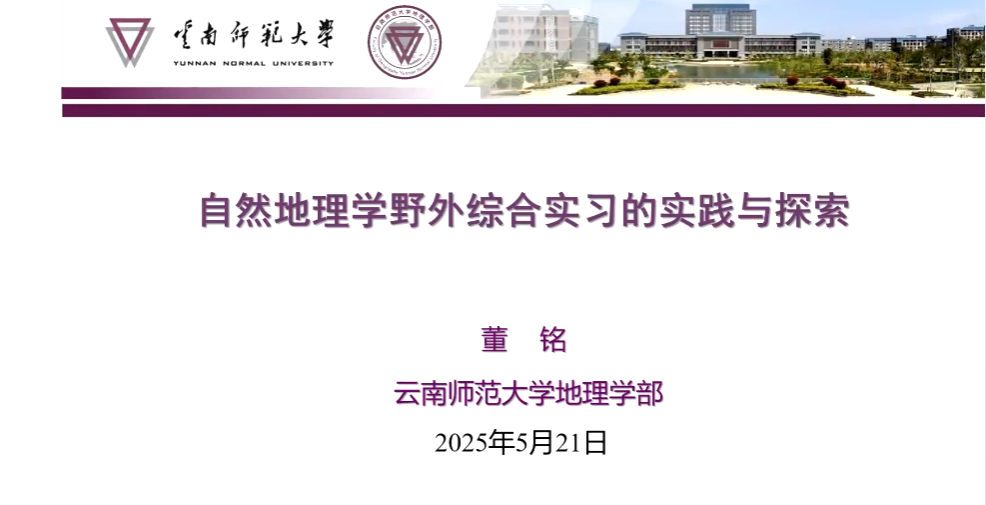 云南师范大学董铭老师以“自然地理学野外综合实习的实践与探索”为主题,介绍了云南师范大学自然地理野外实习课程的开设情况,从云南省的自然地理概况、实习路线安排、主要特色实习资源、实习路线的科学问题及思政资源、实施过程及成效等角度介绍了该课程。通过该课程的建设,提升了学生的实践与创新能力,取得了显著的建设成效。