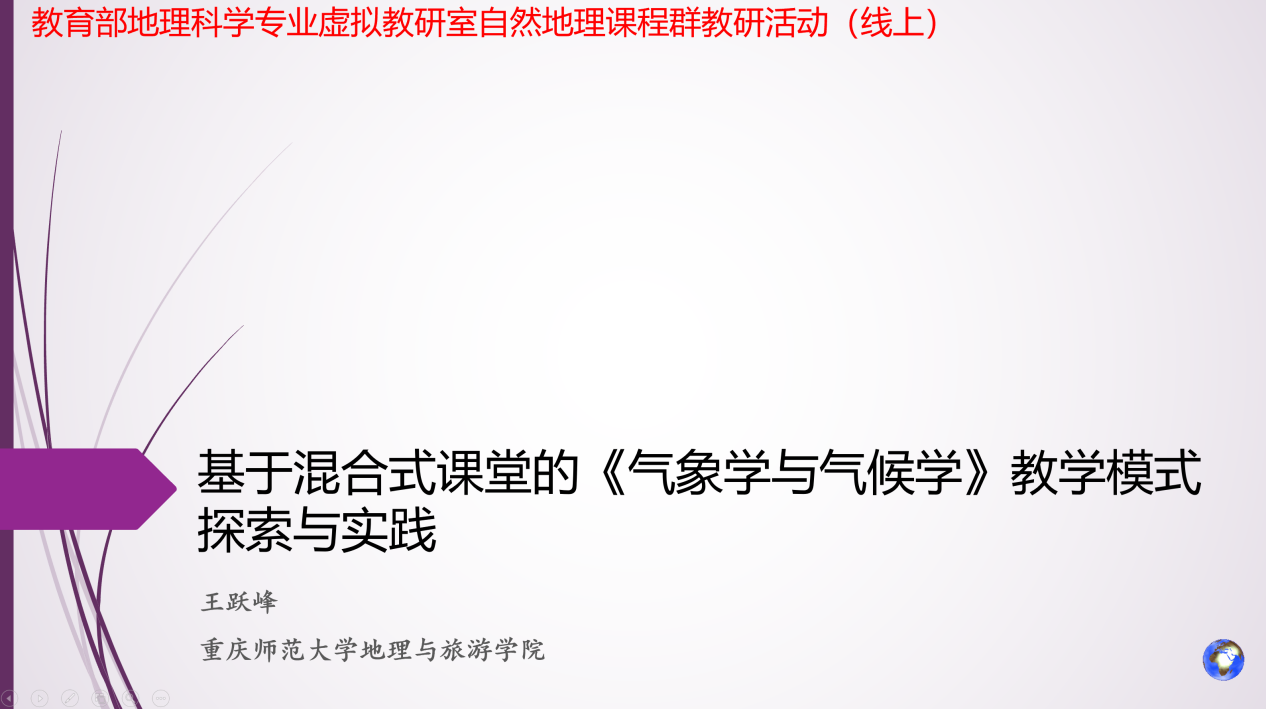 重庆师范大学王跃峰副教授以“基于混合式课堂的《气象学与气候学》教学模式探索与实践”为主题,先介绍了重庆师范大学自然地理学课程体系设置概况,然后以《气象学与气候学》课程为例,从教学设计、教学环境、教学方法、教学评价、改革成效、特色与创新、下一步工作计划等几个方面介绍了该课程线上线下混合教学的经验。该课程通过气象热点问题、天气预报、气象气候思政、高中气象气候知识、高考气象气候试题等,丰富了课程资源,实现了和基础教育需求的对接。