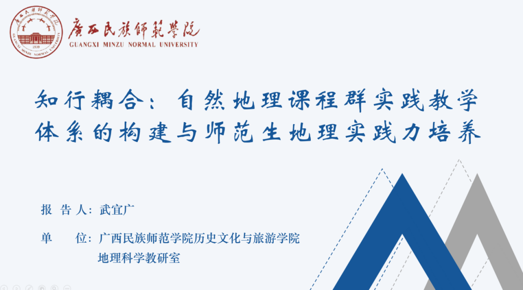 广西民族师范学院武宜广博士以“聚知行耦合:自然地理课程群实践教学体系的构建与师范生地理实践力培养”为主题,先介绍了广西民族师范学院自然地理学课程群开设情况,然后基于师范生地理实践力核心素养的培养,详细介绍了该校野外实习、实训室建设、3S融合提升地理实践力系列实验等经验,展示了广西民族师范学院在自然地理实践教学方面的成果。