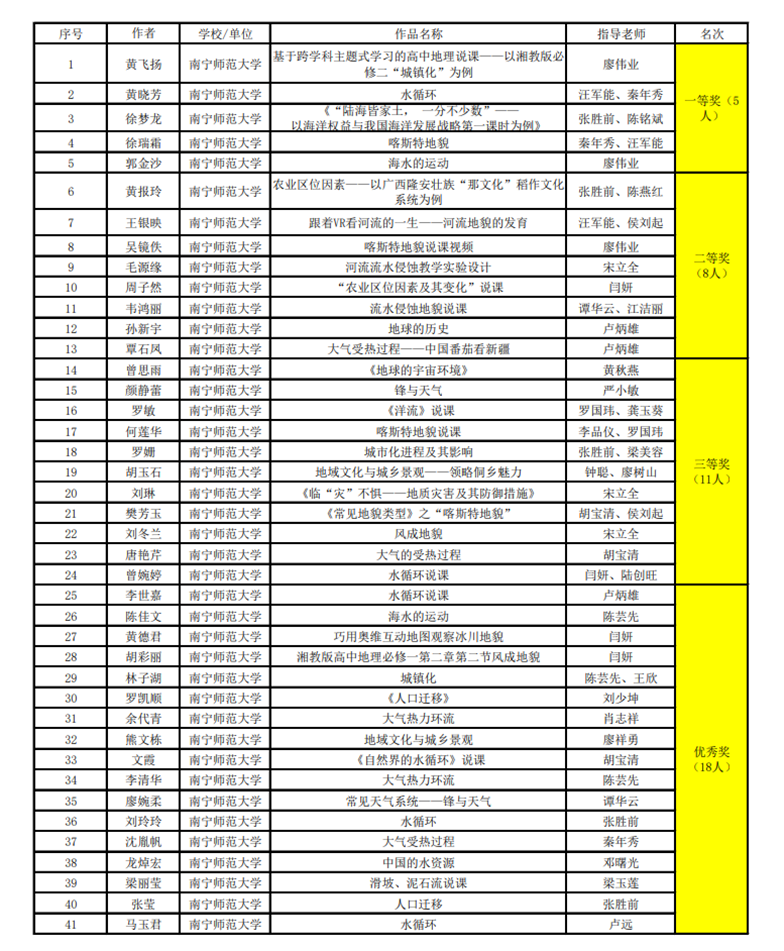 近年来,在各级地理教育师范技能大赛和教研成果评比活动中,我院地理教育硕士研究生频获佳绩,这是我院找准提高研究生培养质量的着力点、不断增强研究生实践与创新能力的体现。我院将赓续探索、创新精神,为地理教育领域培养更多优秀人才,推动研究生教育的高质量发展。