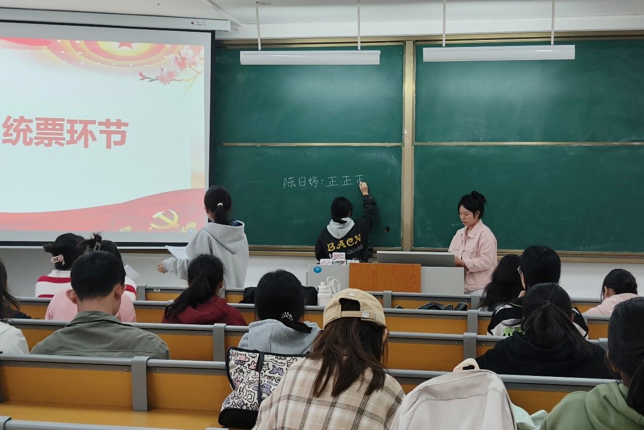 会上,团支书欧阳婷婷介绍本次会议的议程、投票规则以及注意事项。推选对象陈日婷从自身体会出发,对入党动机、学习态度、生活态度等几个方面进行自我陈述,表示希望加入党组织,不断学习发展和进步,更好地发挥新时代青年的担当作用。驻党李韩琪对推选对象进行民主提问,同学们进行民主投票。最后,驻党李韩琪总结本次会议,鼓励更多共青团员积极向党组织靠拢。