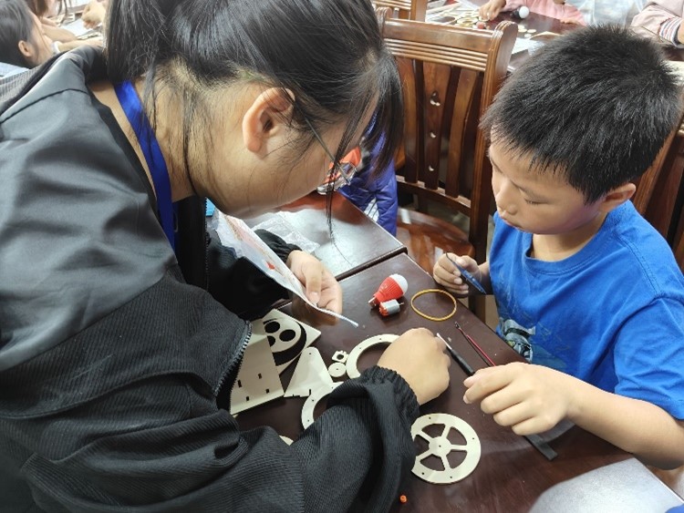 活动伊始,小朋友们齐齐落座,志愿者给他们讲解了一节主题为“环保大作战”的科普知识课堂,让他们了解环境污染的类型以及如何保护环境。在这之后,志愿者帮助小朋友们制作手摇发电机和纸杯电风扇,这不仅让他们感受到手工带来的乐趣,更重要的是锻炼了他们的动手实践能力。除此之外,志愿者们还举办了模拟垃圾分类的投放活动,小朋友们拿着写有垃圾名称的纸片投放到相应垃圾类型的垃圾桶中,充分让小朋友们了解垃圾分类的小常识。