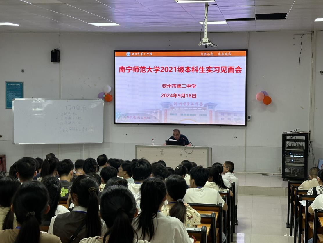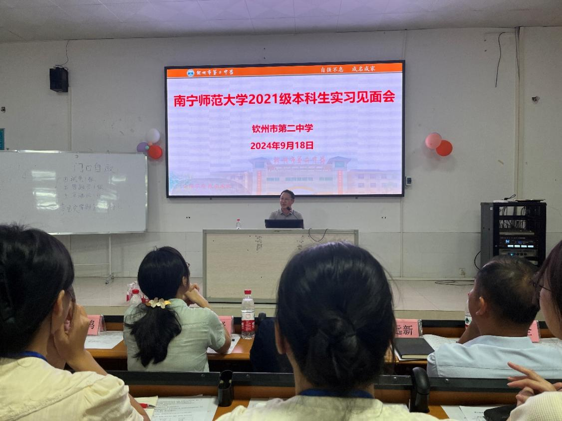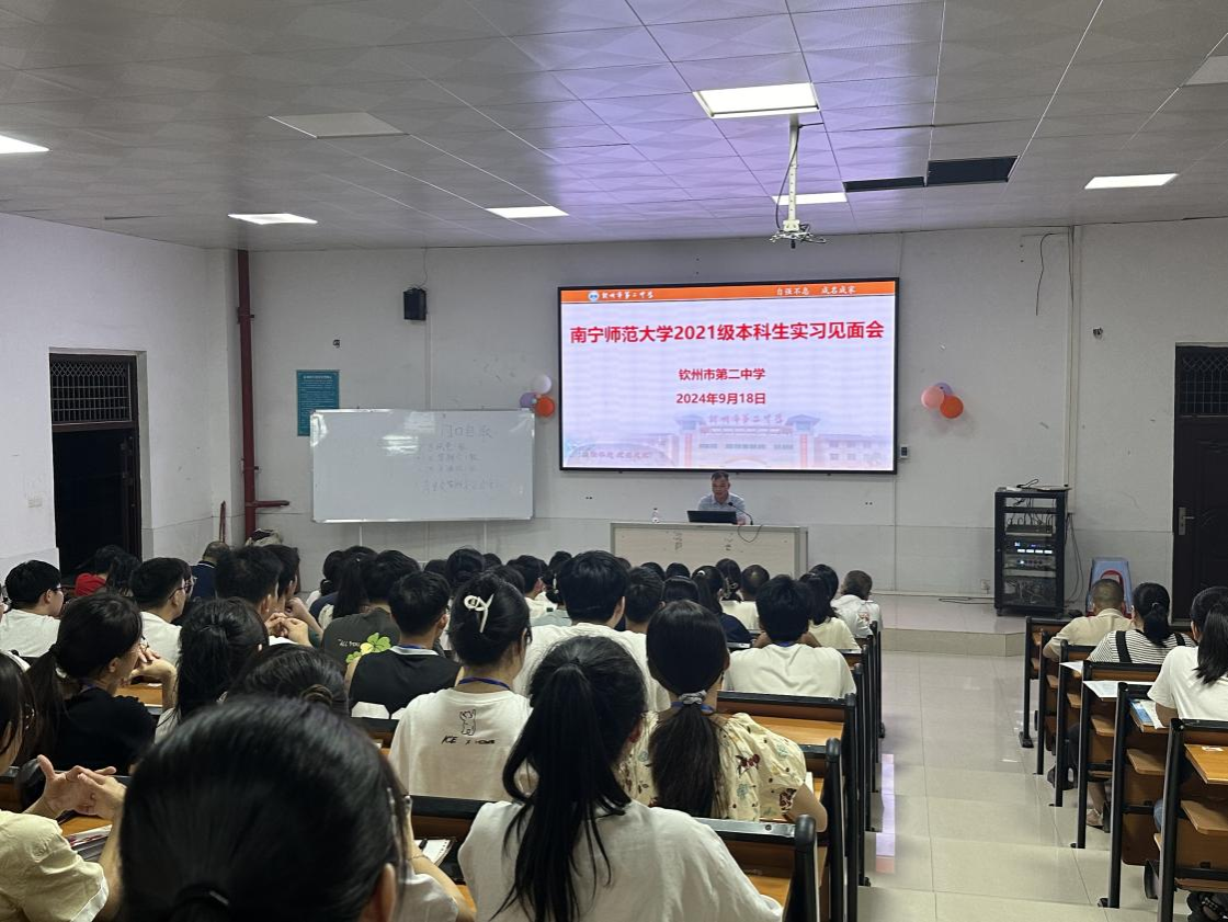 步入学习气氛浓厚的二中校园里,看着活泼热情的同学们与亲切和蔼的老师们,suncitygroup太阳成集团的实习教师对此次教育实习充满了期待。9月18日晚,suncitygroup太阳成集团2021级本科生实习见面会在钦州市第二中学阶梯教室召开。此次会议由钦州市第二中学的袁盛林主任主持,钦州市第二中学的谭鸣副校长、高一年级主任陆元谋、高一地理组老师等共同参加。