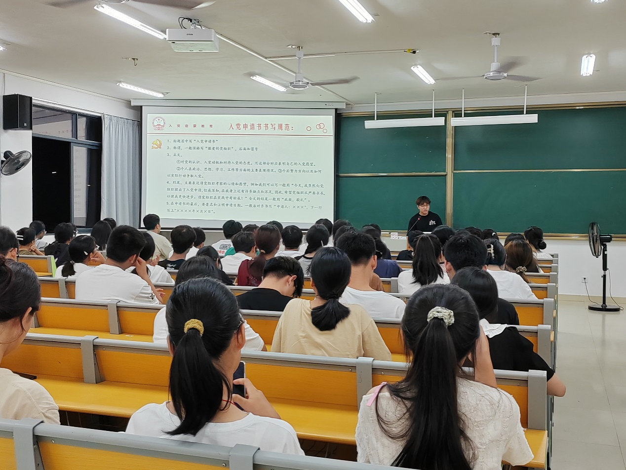 会议伊始,赵生同志通过党史微电影内容,围绕“谈对党的认识”展开互动,提升新生对党的基本知识的深刻认知,进一步明晰党的初心和使命,引导树立正确的入党动机,积极主动向党组织靠拢。李乐彬同志向新生介绍入党基本流程、入党申请书的书写规范及基本要求。