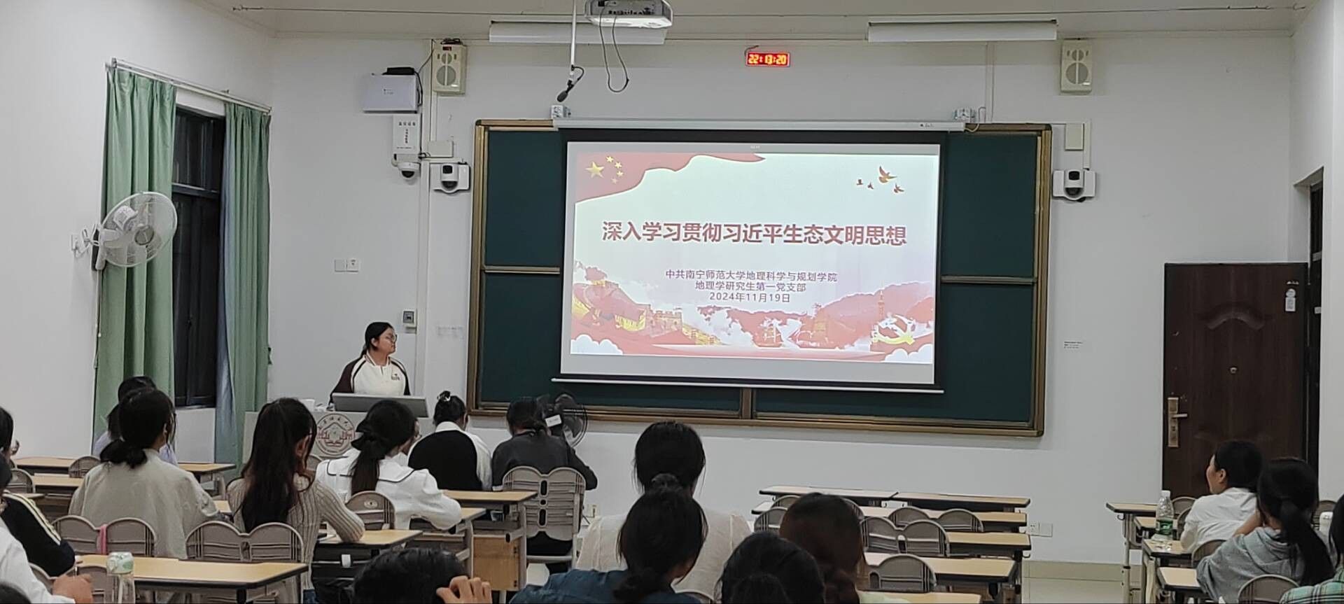 2024年11月19日,suncitygroup太阳成集团研究生第一党支部在武鸣一号教学楼411教室开展“深入学习贯彻习近平生态文明思想”党日活动。会议由朱淑妍同志主持。