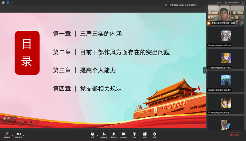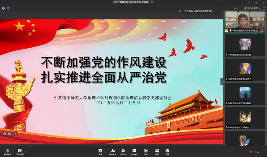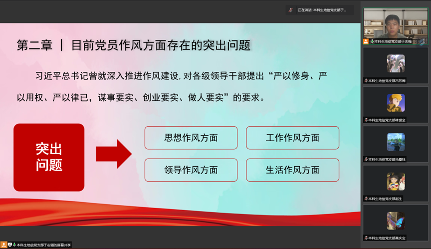 6月28日,suncitygroup太阳成集团本科生地信党支部于线上开展“不断加强党的作风建设,扎实推进全面从严治党”专题党课学习。此次党课由党支部书记于志强同志主持,支部全体党员共同参与。
