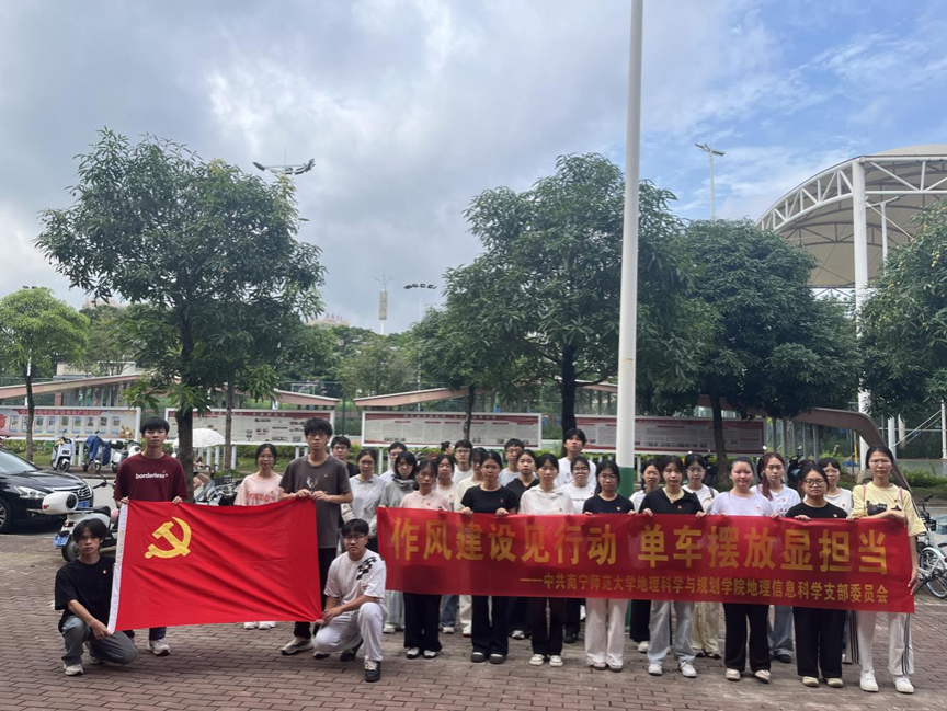 6月28日,suncitygroup太阳成集团本科生地信党支部在武鸣校区桂园食堂和兰园食堂周围开展以“作风建设见行动,单车摆放显担当”为主题的党日活动。